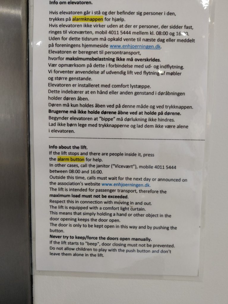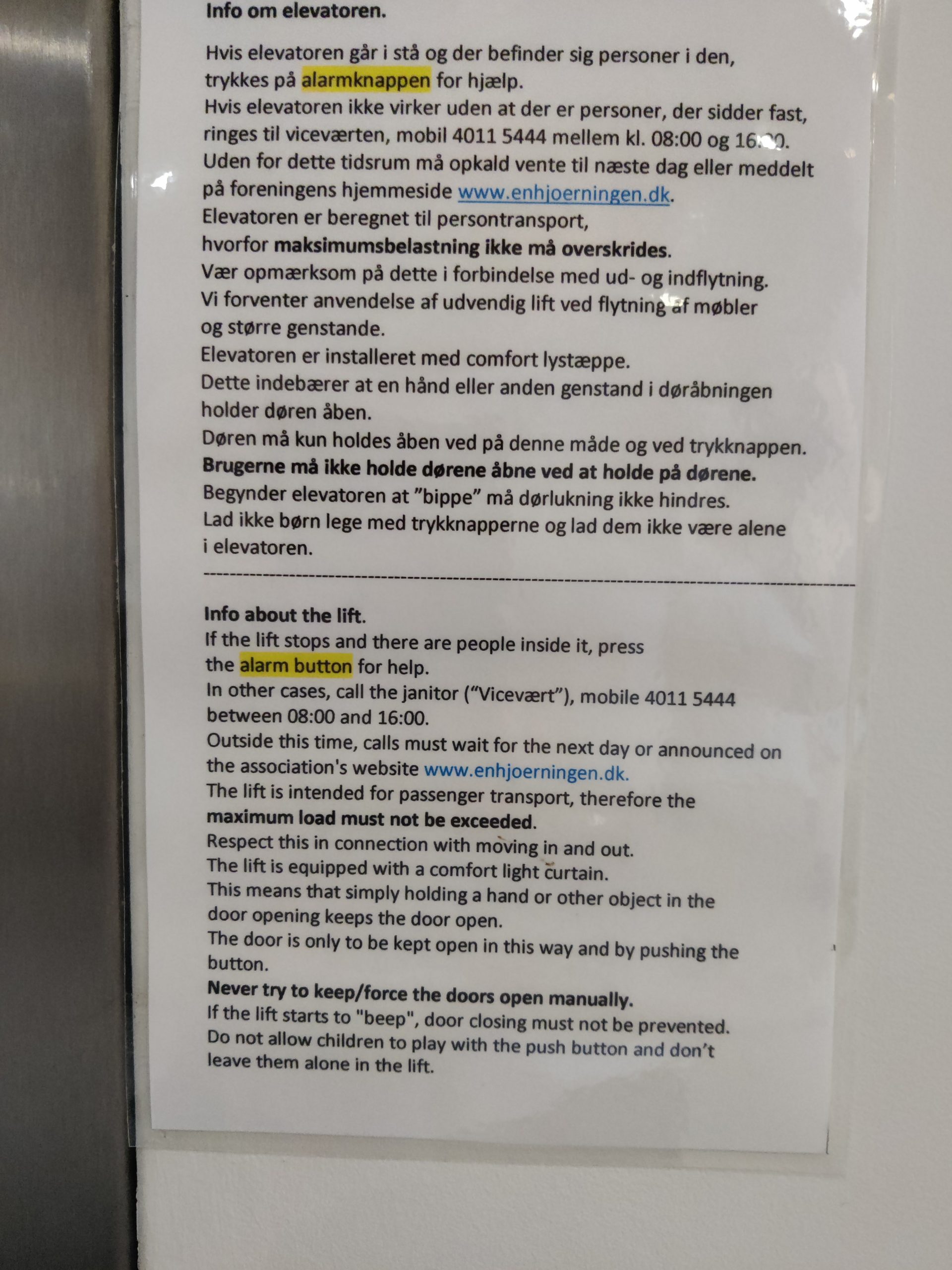 Hvis elevatoren ikke virker uden at der er personer, der sidder fast, ringes til viceværten, mobil 4011 5444 mellem kl. 08:00 og 16:00.